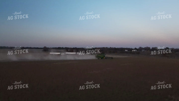 Aerial of Soybean Harvest with Trucks and Combine at Sunset 7381