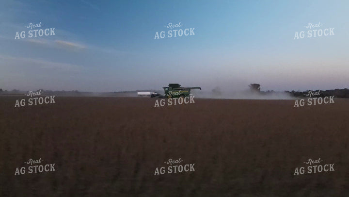 Aerial of Soybean Harvest with Trucks and Combine at Sunset 7382